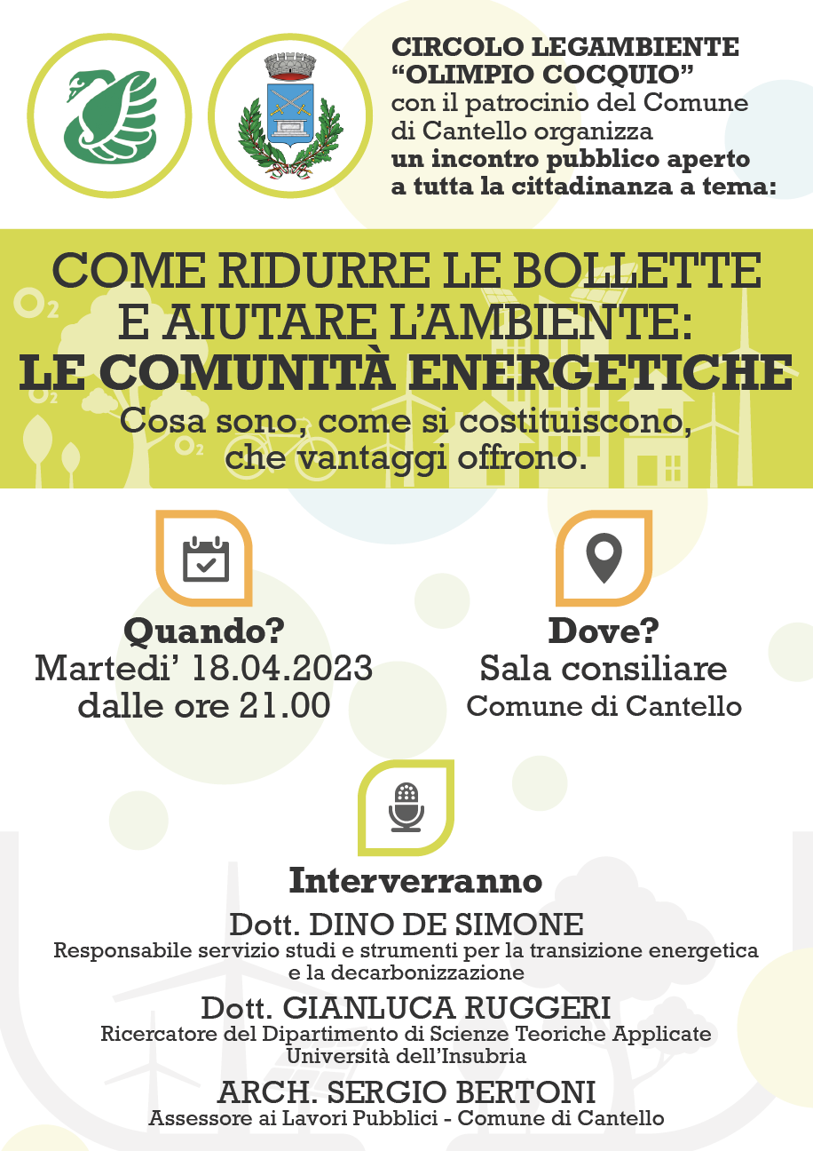 CIRCOLO LEGAMBIENTE “OLIMPIO COCQUIO” con il patrocinio del Comune di Cantello organizza un incontro pubblico aperto a tutta la cittadinanza a tema: